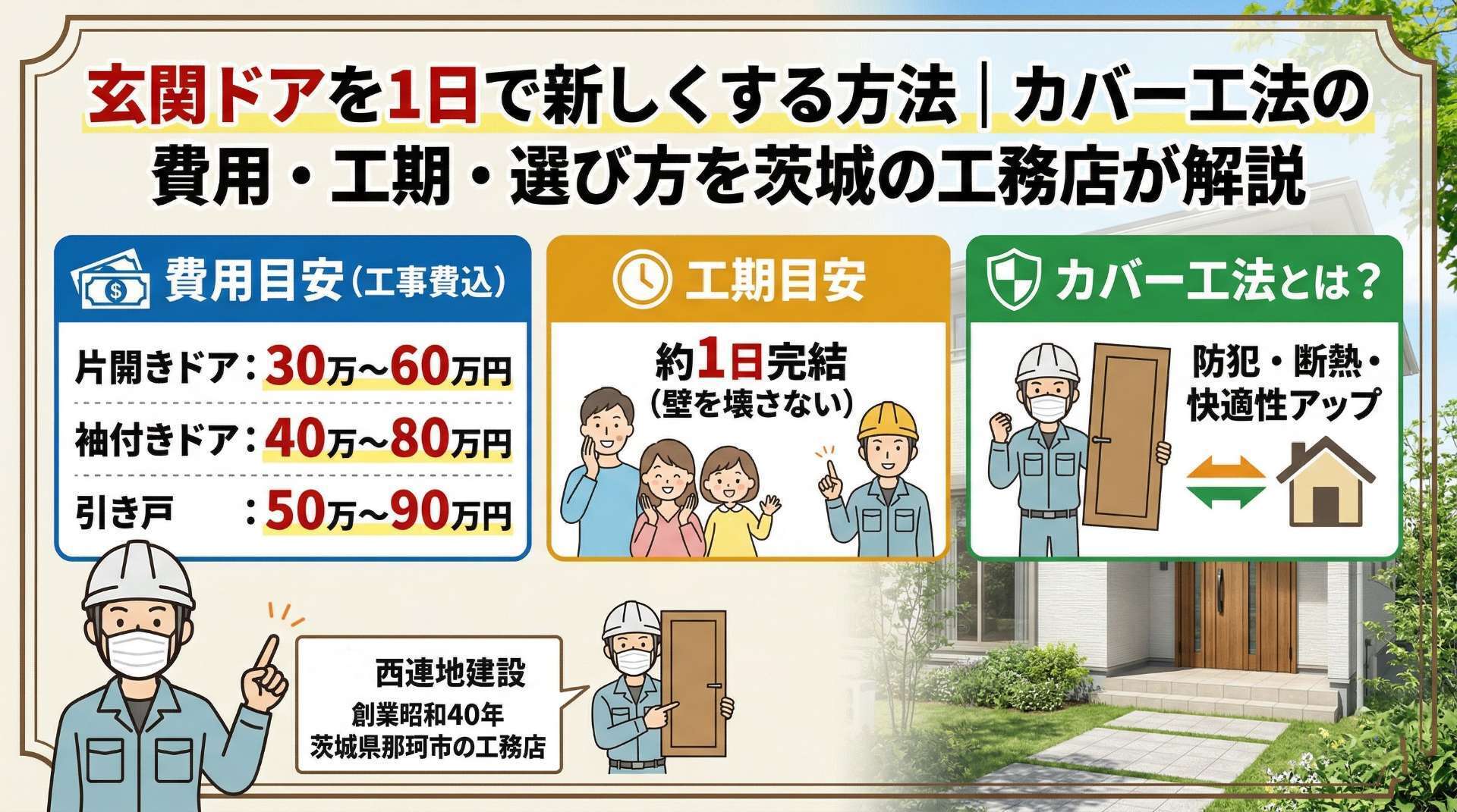西連地建設では、昭和40年の創業以来、那珂市・常陸太田市・ひたちなか市周辺の戸建て住宅のリフォームに対応してきました。玄関ドア・勝手口ドアの交換はもちろん、防犯や断熱の観点からどの製品が合っているかをご提案します。「まず見てもらいたい」という段階からお気軽にどうぞ。